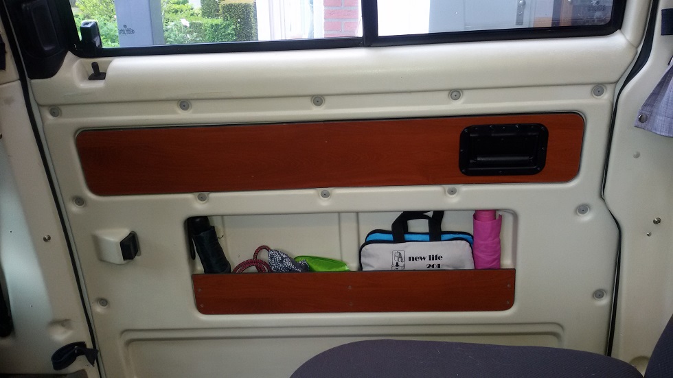 Daar ik deze toch wilde vervangen met trespa heb ik daar maar gelijk een kistengreep ( met veer ) in geplaatst. Zodat ik de schuifdeur nu zonder geluid dicht kan maken, ideaal voor als je s ’avonds of s ’nachts nog even naar buiten wil en je de mede kampeerders niet wakker wil maken met het dicht maken van de schuifdeur.