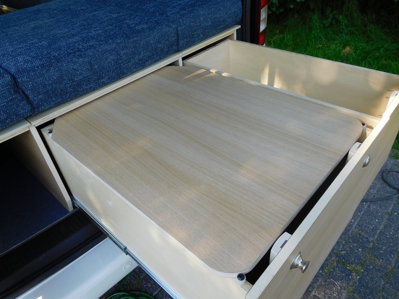 Na het aansluiten van het Elektrisch paneel verder gegaan met de zit/slaapbank. Aan de achterzijde hebben we een diep vak met deurtje voor onze Coleman Sling chairs en voorlopig de tarp. (luifel komt wellicht later) In het midden een grote lade met mogelijkheid voor het opbergen van de tafel en aan de rechterzijde nog een volledig uittrekbare lade. Lades zijn via de deksels ook binnenuit bereikbaar. Alle kussens voor het brede bed zijn intussen ook klaar.