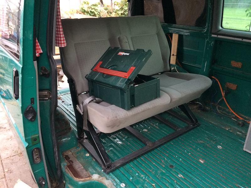 Ik heb de zithoogte inderdaad groter gemaakt, ongeveer hetzelfde als de omgedraaide rechterstoel ten opzichte van de vloer van de laadruimte. Ik vind dat lekkerder zitten, en het lost ook het probleem van de potti op. Bijkomend voordeel is dat ik daar ook de huishoudaccu kwijt kan.