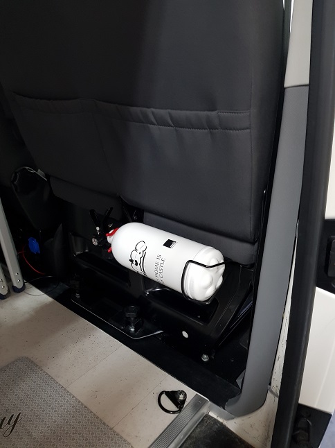 Gelijk maar even veranderd, de blusser dus hoger gehangen. Bij de schuifdeur paste het niet en het idee van Geert om hem onderaan de bestuurders stoel te hangen vind ik niet zo fijn, te ver weg in mijn idee. Dus toen maar even 2 rvs beugeltjes gemaakt en nu kan de bank weer draaien ook met de handrem aangetrokken.