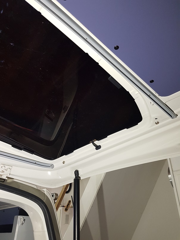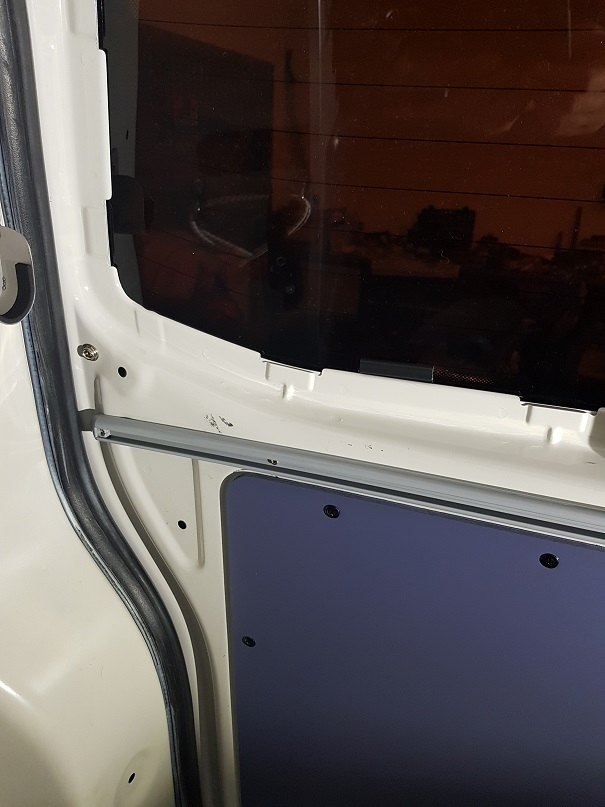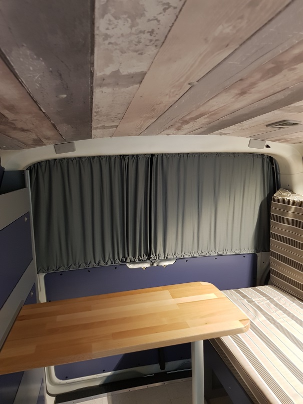 Ik heb geen detail foto's, maar kan deze wel maken indien gewenst. De stretch gordijnen met voorgevormde rails heb ik gekocht bij Kiravans uit Engeland, net als mijn nog te plaatsen rechter zijraam met schuifruitje. De rails past perfect, je moet wel opletten of je voor een klep met of zonder achter ruitenwisser besteld.