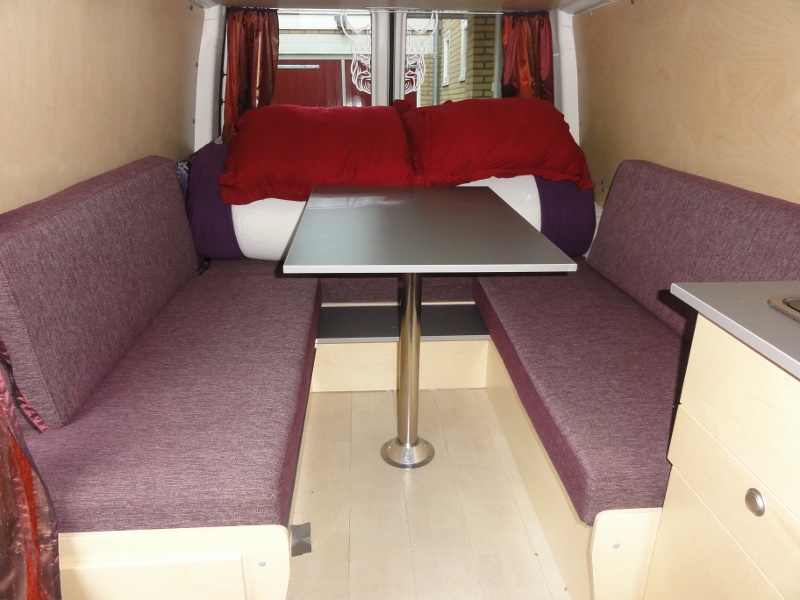 Tussen de banken komt een tafeltje, de zitkussen worden snachts gebruikt als bed met een maat van 160*190 cm.