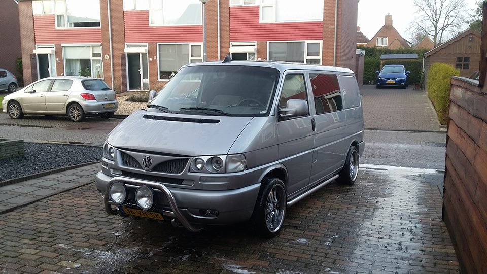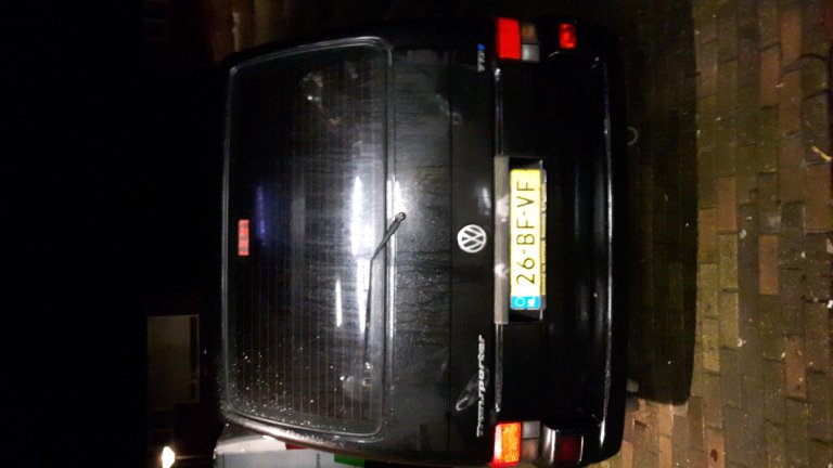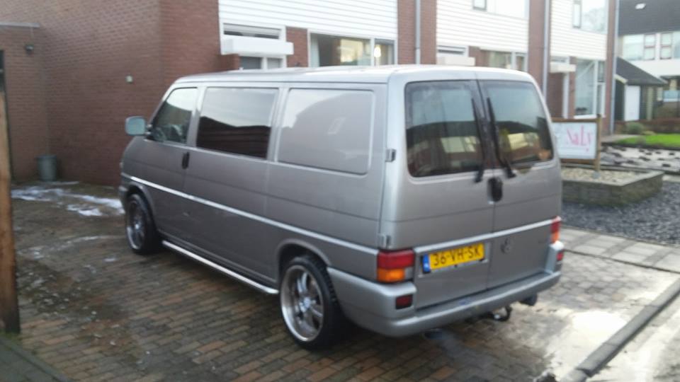 Het is een zwarte t4, niet overdadig lang, maar leuk. Getint glas, ( folie ) en achterklep ipv deuren. ( ideaal om te vissen in de regen :toppie )