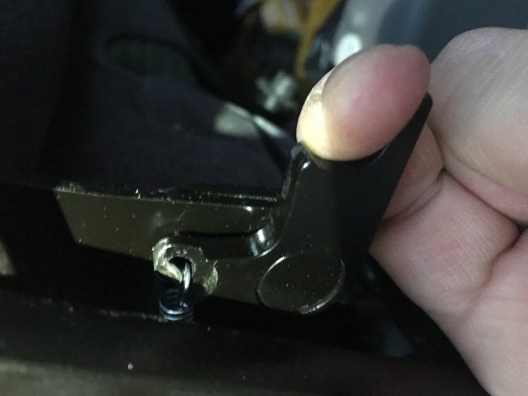 Bij mij was het veertje eruit. Het driehoekige stukje dat kan draaien is en blijkbaar ergens in moet haken is wel een beetje versleten bij het gat. Nieuw veertje gehaald, maar het helpt (nog) niet. Misschien heb ik het verkeerd geplaatst? Hieronder wat foto’s..