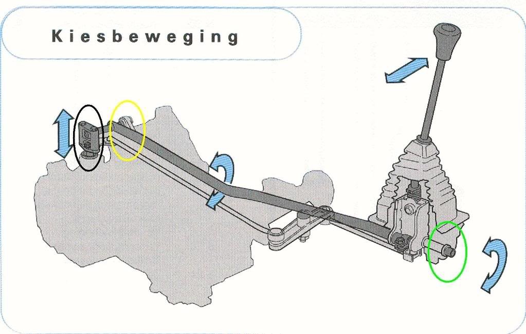 Ik zou als eerste de schakelbolletjes eens goed controleren en zo nodig vervangen, want die spelen een rol bij de kiesbeweging (eerste plaatje de gele en zwarte cirkel). En daarna eventueel nog de schakelpook afstellen.