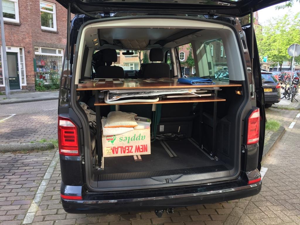Zo ziet het uit als het bed in elkaar geschoven op de achterplank ligt. Ervoor zie je de rugleuning van de driezitsbank en voorin de kistjes.