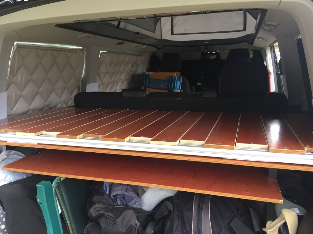 Op het multiflexboard willen wij uitschuifrails bevestigen en daarin een lattenbodem monteren die wij over de naar voren neergeklapte achterbank trekken. Het voordeel is dat je zowel achterin als ook voorin veel bagageruimte houdt en niet elke avond alles moet verplaatsen.
