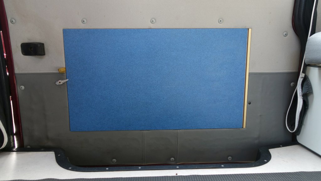 Bedankt voor de foto van de tafel in (?) de schuifdeur. Het lijkt of de tafel in een frame geklemd wordt dat op het paneel is bevestigd. Dus dan zou het paneel verder intact blijven. Toch eens nameten hoeveel ruimte er zit tussen het paneel en de buitenkant van de bus als de schuifdeur open gaat, en hoe dik deze constructie dus totaal kan zijn.