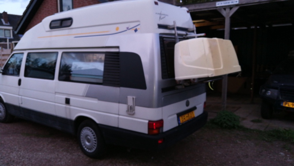Het is dus een LWB T4 waar ze met polyester of glasweefsel een extra achterkant op gezet hebben waar de natte cel in zit, en bovenop hebben ze een omgekeerde roeiboot gelijmd. En op de een of andere manier ziet het er nog leuk uit ook! TOP :jumpklap