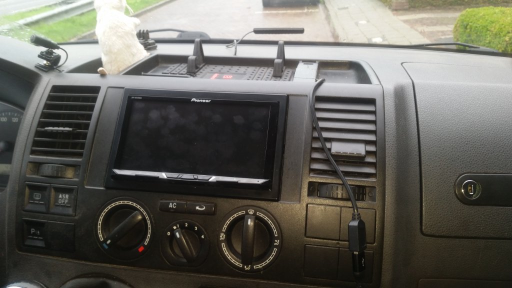 Ik heb wel in het dashboardbakje bovenop een paar kleine inkepingen en openingen gemaakt om de kabeltjes voor microfoon, DAB+ antennen en de USB aansluiting naar buiten te kunnen leiden.