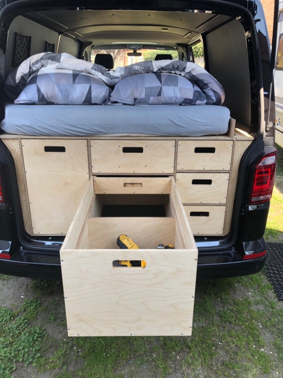 - De houtbouw heeft een collega schrijnwerker gedaan, laden voor gereedschap en camp materiaal met daar bovenop een ikea matras.