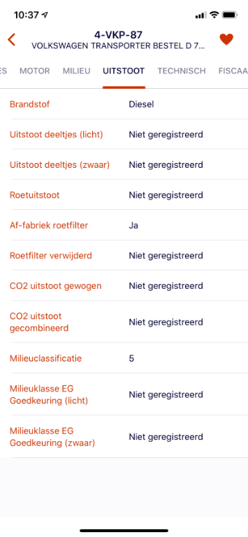 Vul vervolgens het kenteken in en ga naar het tabblad ‘Motor & Milieu’. Klik op ‘Uitstoot’. Bij V.5 ‘Uitstoot deeltjes’ staat de fijnstofuitstoot van de auto.