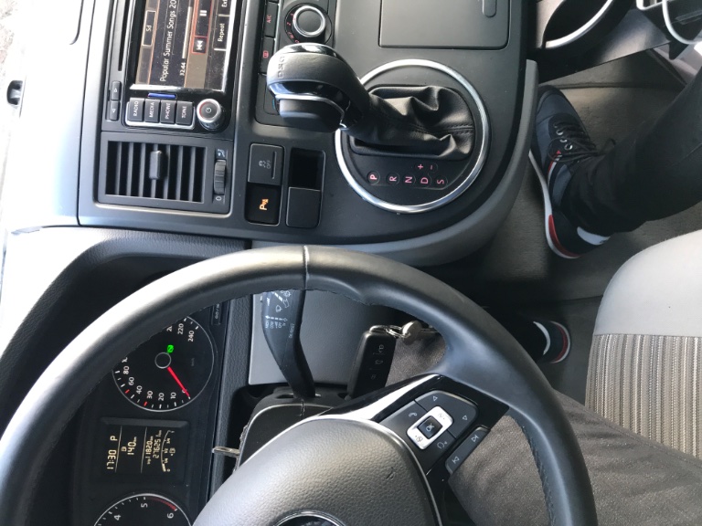 Nu is er dus een deel van de bodem niet bedekt omdat het deel van het dashboard waar de versnellingspook in steekt bij een Multivan breder is dan bij een gewone Transporter. Maar ik voel er niet zoveel voor om weer op zoek te gaan naar een andere mat en het hele project overnieuw te doen. Bovendien zal de mat moeilijk verkoopbaar zijn omdat-ie alleen in een Multivan past.