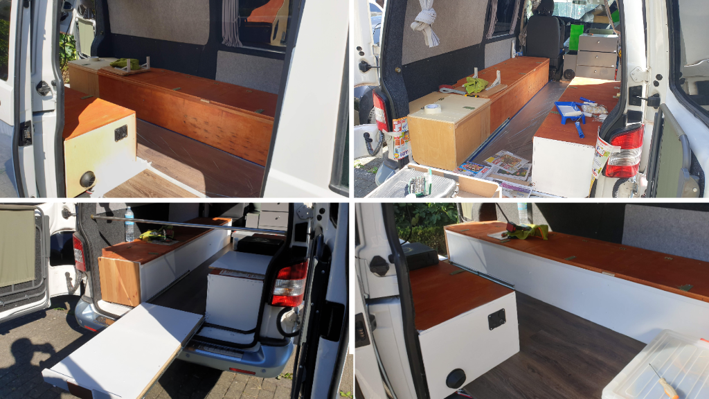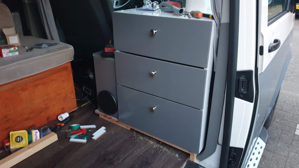 Achter midden kant 1 meter uitschuifbare lade gemaakt en er op een kleine quick use keukentje.