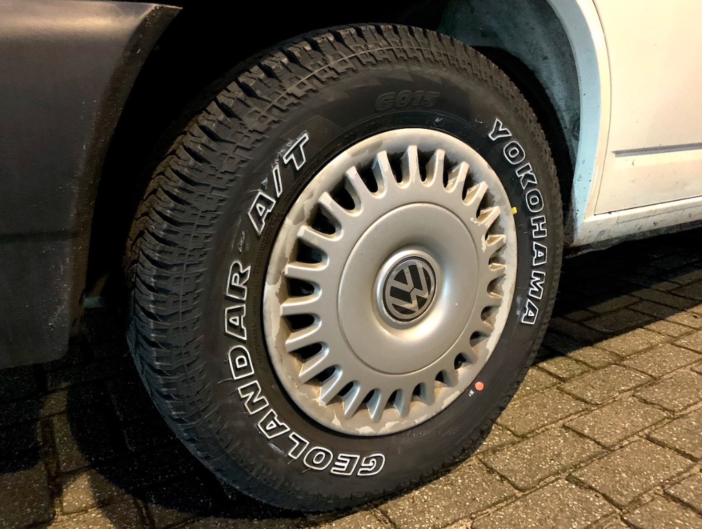 Tot voorkort was het plan om General Grabber AT3's in de maat 215/75R15 op 1 van de 2 setjes velgen te laten zetten, deze maat band zou zonder aanpassingen aan de wielkasten of bumper op beide originele T4 velgen moeten lukken (met dank aan Pascal). Maargoed: dat plan gaat waarschijnlijk van de baan.