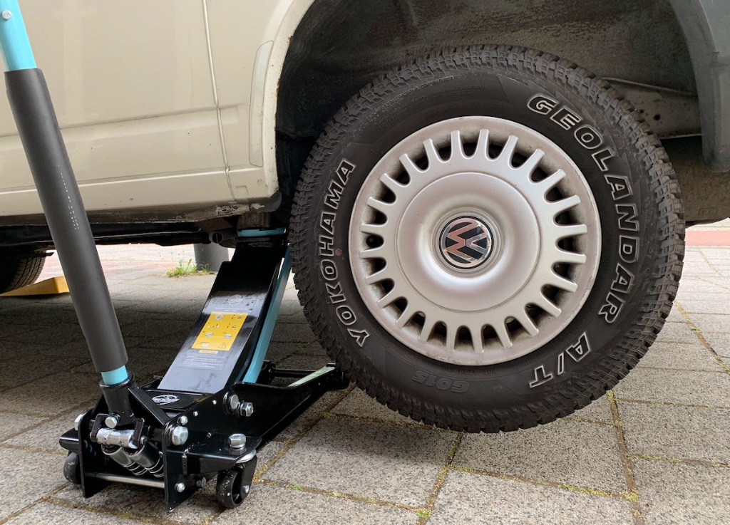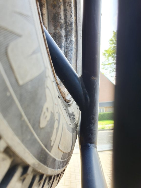 - Het reservewiel moet nog op de beugel passen