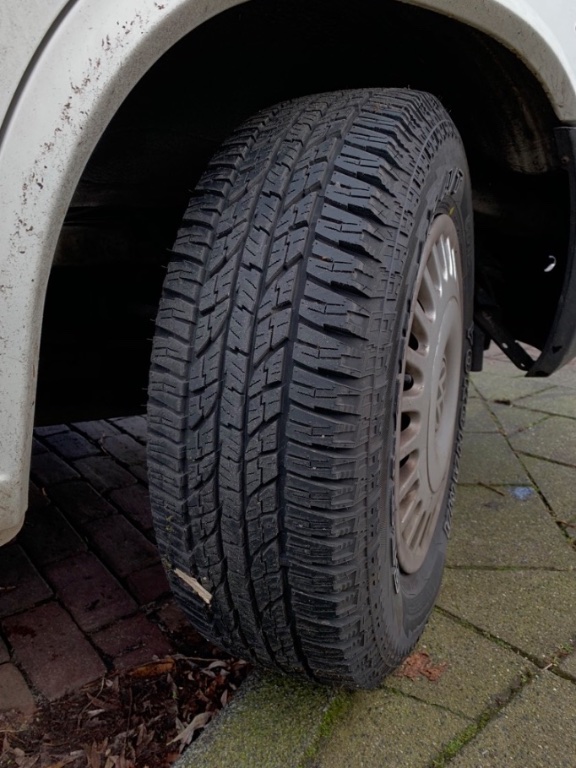Ik ben uitgekomen bij de Yokohama Geolandar A/T G015, maatje 215/70 R15. Deze is als mildere AT band mooi tussen de grovere AT en MT banden van Yoko in. De band heeft een Load Index en is dus met 750 kg per band lichter dan orgineel. Gelukkig zijn we zelfs op vakantie vrij licht beladen en halen we de 2.800 kg echt niet.
