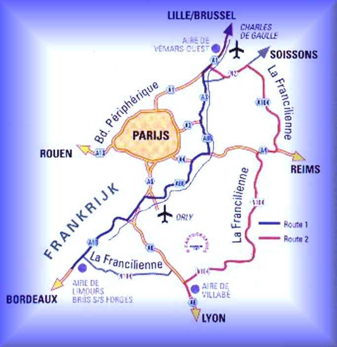 Alternatief is evt. de A86 oost-om Parijs nemen, of de Francilienne oost-om. Die laatste gaat ruim om Parijs heen, maar rijdt wel relaxt.
