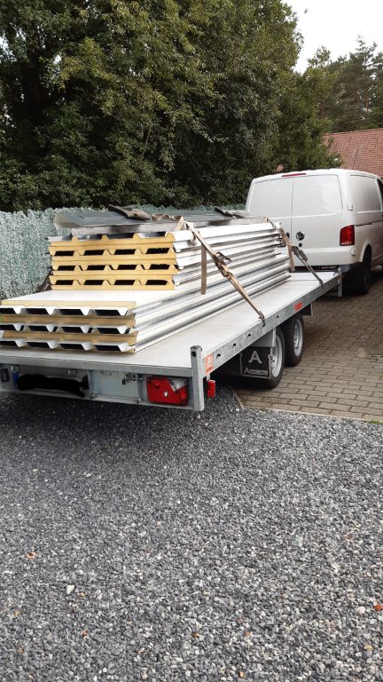Aanhanger geladen met dakplaten voor een nieuwe overkapping Geladen met mijn kleine traktor , om een dagje in het bos te gaan werken En een aanhangertje betonpuin wegvoeren