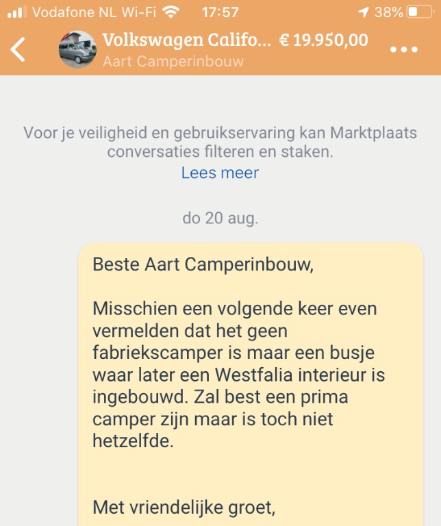 Dat is natuurlijk waar maar bij een fabriekscamper weet je wel dat alles goed is ingebouwd en wat de leeftijd van het interieur is. Hoe dan ook is de waarde van een achteraf inbouw in principe lager dan van een fabrieksinbouw in een vergelijkbare conditie. Het niet vermelden of zelfs vermelden dat het om een originele camper gaat is dan ook misleiding.Multivan Generation schreef: 22 aug 2020, 06:43 Onder de streep is iedere originele westfalia een omgebouwde bus..