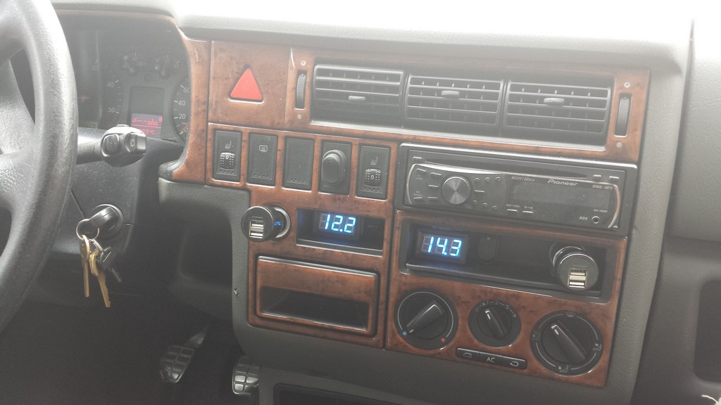 Door de bus 5 stuks 12 volt contacten, en 2 stuks 220 volt stopcontacten.