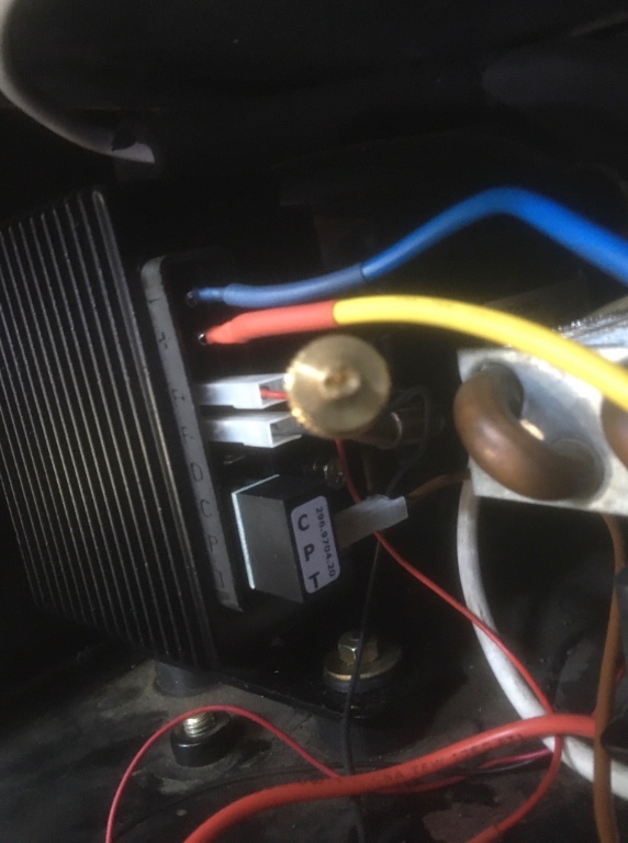 Deze regelunit verwacht een contact tussen C en T en het display stuur een regelspanning van 7.2 - 12 VCD. Westfalia heeft als oplossing een schakeltransistor in een blokje bedacht. Dit blokje klemt over C,P en T en de bruine draad wordt aan de voorzijde aangesloten.
