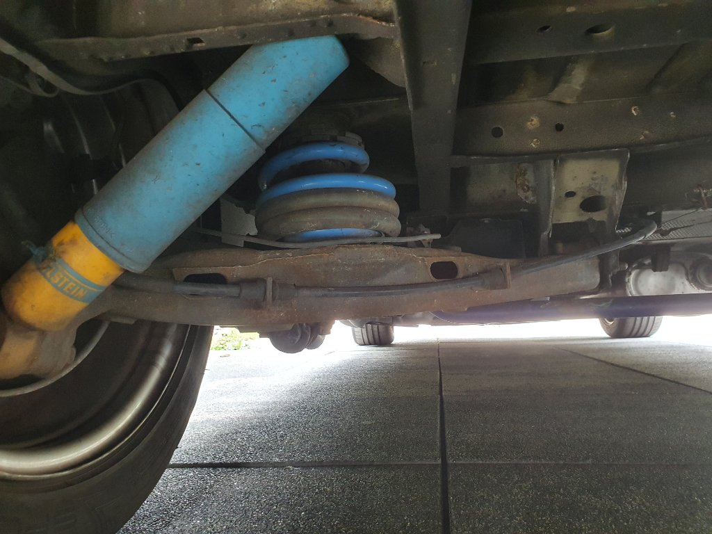 Hart wielnaaf tot spatbordrand stond standaard origineel op 47 cm. en nu na verlaging op 38 cm., dus 9 cm. gezakt. Natuurlijk komt hij automatisch al 4 cm. lager te staan (47-4=43) door het vervangen van de standaard veren/dempers voor B14 schroefset (? zeg ik dit goed ?) en met nog eens schroeven ca. 5 cm. verder lager gezet (47-4-5=38) dan de standaard waarde van deze schroefset (die nog 2 cm. verder zou 'mogen' volgens Bilstein).