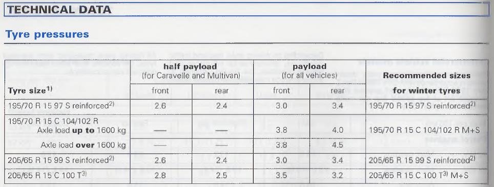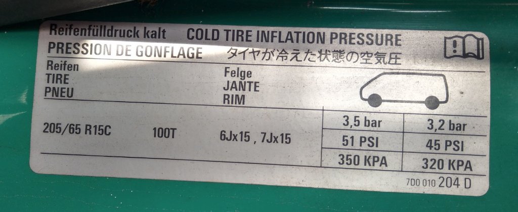 Hier een wat uitgebreidere toelichting op wielen en banden. Inclusief de aanbevolen spanning: https://t4-wiki.de/wiki/Rad