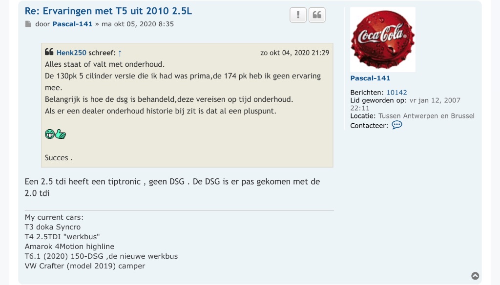 Als iemand hier nuttige tips kan geven of ik er verstandig aan doe deze T5 te kopen dan hoor ik het graag. De garage waar hij voorheen in onderhoud was was niet negatief over de wagen. En hij gaf aan dat hij altijd goed onderhouden is geweest.