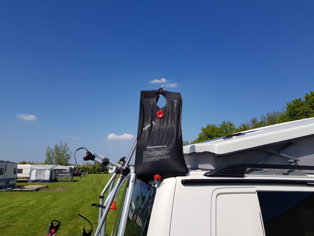 Maar met een beetje creativiteit kom je heel ver, ik zag trouwens ook een douche met pomp van de Decathlon, die is opvouwbaar en kan naast je staan tijdens het douchen.