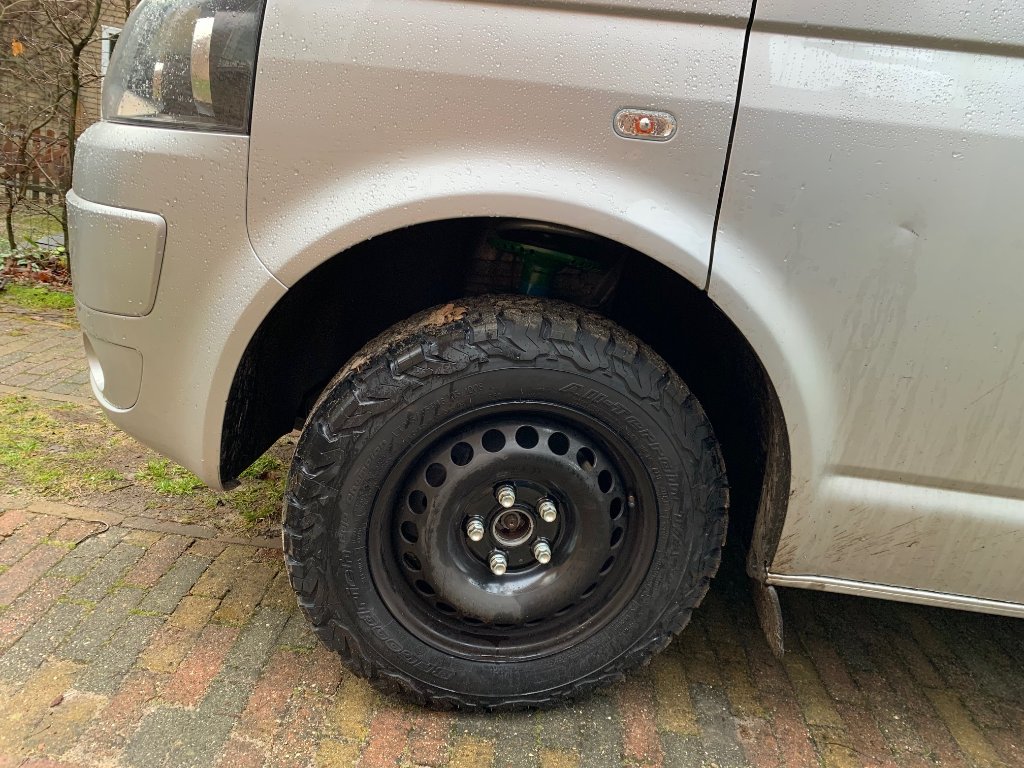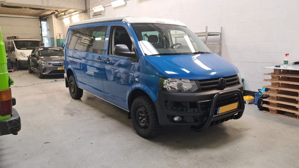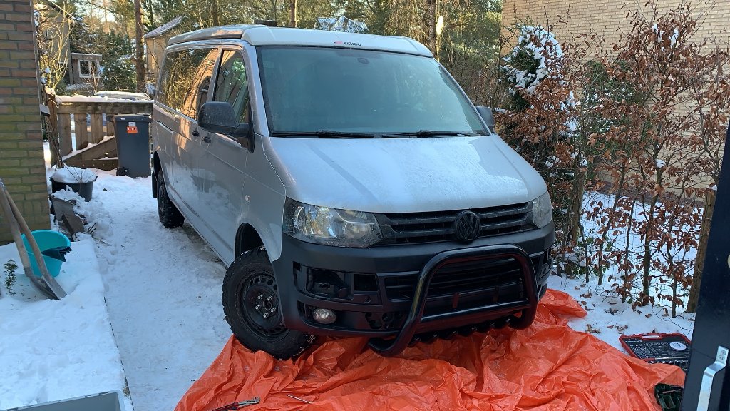 Eerst is de bus verhoogd met een Bilstein Pro-Lift Kit met Eibach Pro-Lift verhogingsveren i.c.m. off road banden: