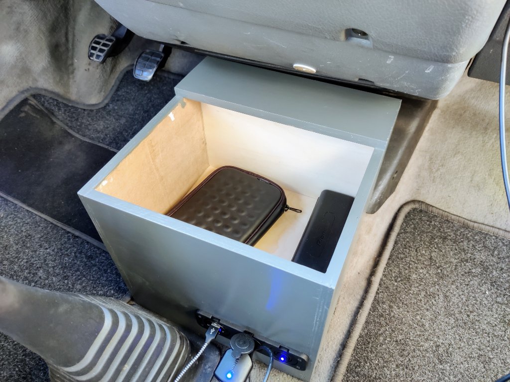 Dit lijkt een constante bij T4s: zoeken naar extra bergruimte rond de bestuurdersplaats. Mijn busje - een Multivan 1,9D uit 1994 met rudimentaire camperinrichting en ingeschreven als kampeerwagen - kocht ik in 2016. Na een poosje maakte ik een eerste extra opbergruimte. Dat was er een die tussen de voorzetels staat.