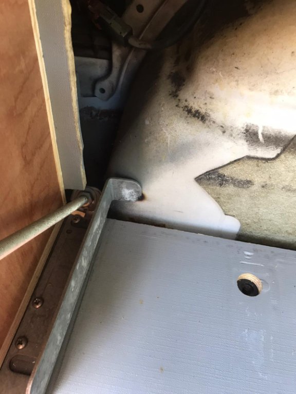 Wat ik verdachter vind is de hoek onderaan de vlek. Op de accu lijkt het alsof het plastic van de accu is gesmolten of in ieder geval enigzins beschadigt is. In de bus zit er een zwarte vlek bij de beugel die de accu op zijn plek houdt en op de wielkast. Het lijkt wel alsof er kortsluiting heeft plaatsgevonden op die plek. Maar dan zou het door de bekleding van de accu heen zijn gegaan.
