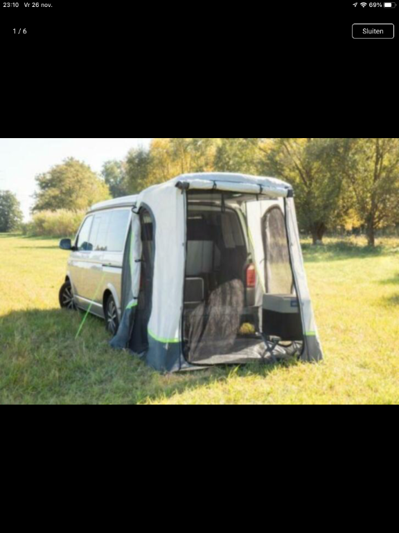 Deze hebben wij dit is overigens niet onze bus maar een plaatje uit de folder. Aan alle kanten zitten ‘deuren’ en horren. En de flap aan de achterkant kun je zelfs nog als luifeltje gebruiken - er zitten stokken bij.