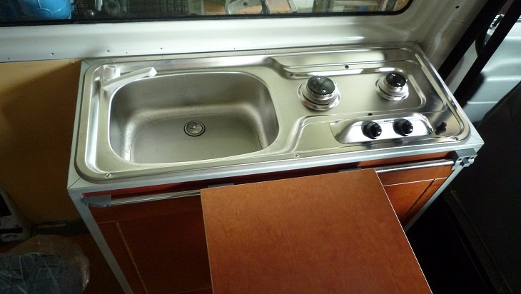 Als je af en toe een motorfiets mee wilt nemen is een keuken achterin naar mijn idee helemaal niet handig. Je kan ook denken aan een keuken(tje) bij de schuifdeur die je naar buiten kunt schuiven of zwenken. Dan houd je de ruimte achterin vrij. Daarvan zijn wel voorbeelden te vinden. Kijk eens bij https://terracamper.de/fahrzeug_modell/tecamp/ voor modulaire interieurs. Ook nu niet bedoeld als ideale oplossing maar ter inspiratie.