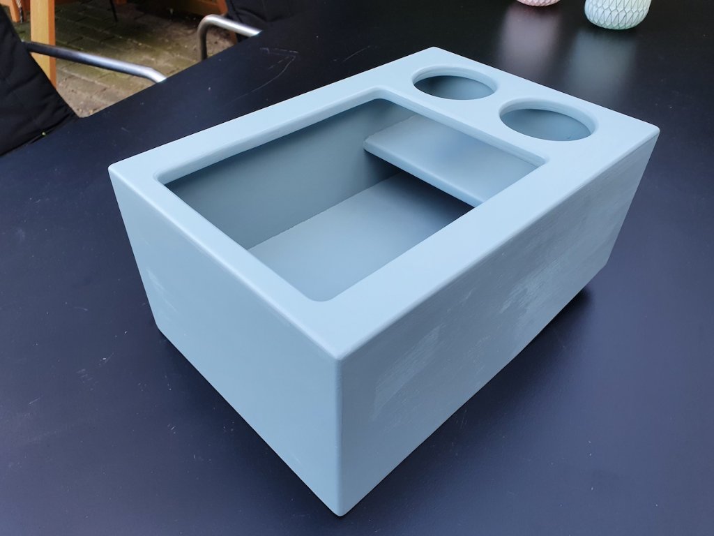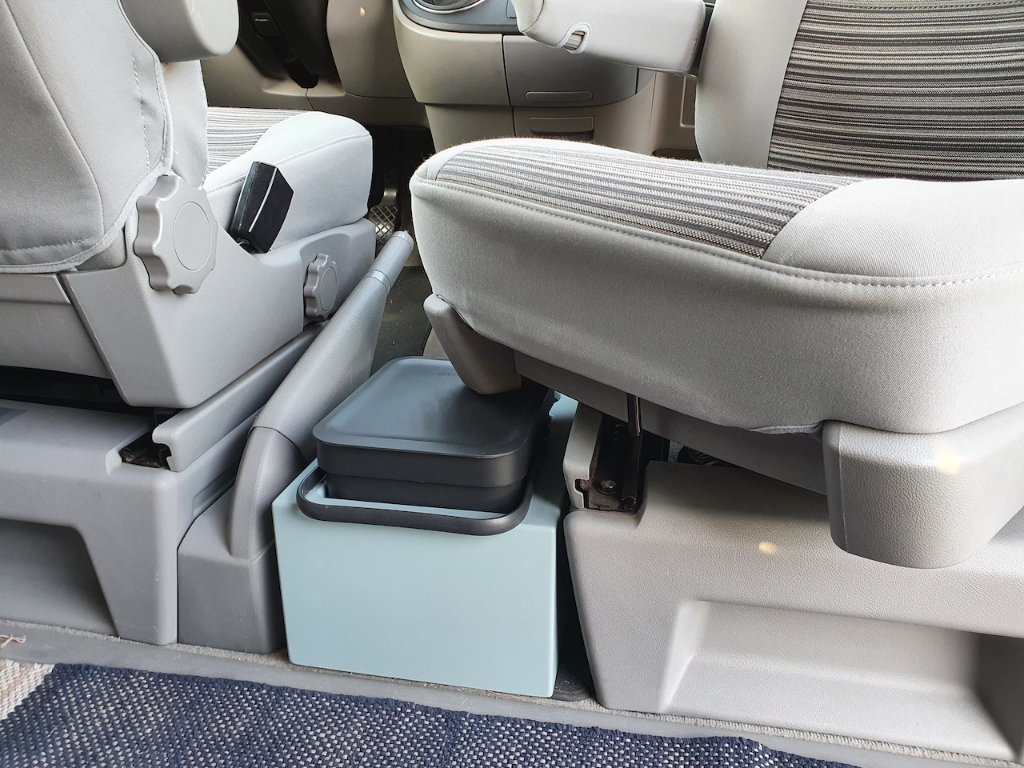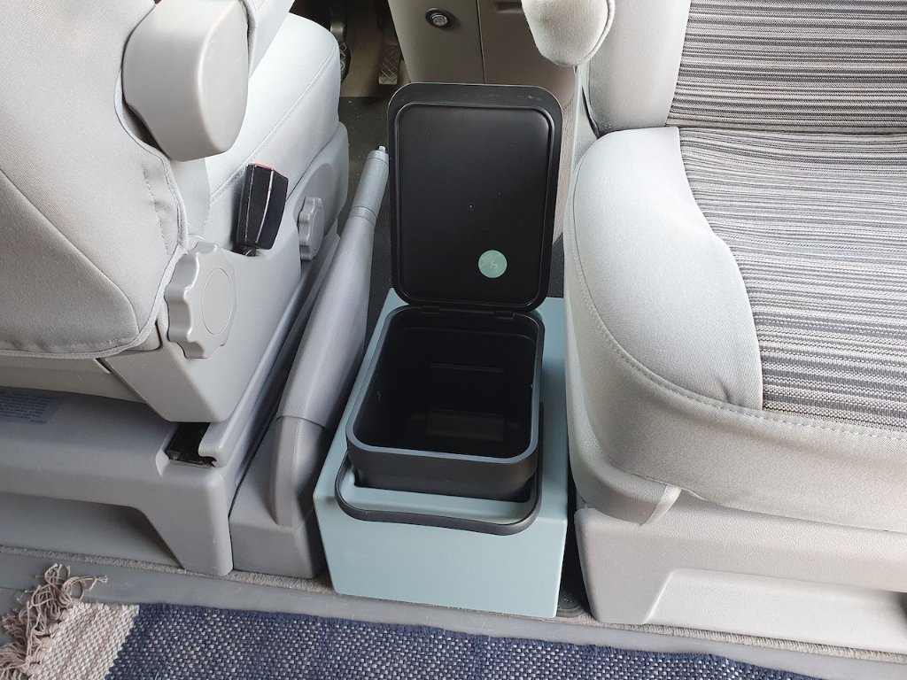 Sinds een paar maanden ben ik eigenaar van een T5 GP California en zocht een oplossing voor een prullenbakje die niet door de bus slingert. Daar heb ik deze houder voor gemaakt, met ook nog 2 flessenhouders erin. Wellicht kan ik anderen ook inspireren met het idee dus ik zal er ook een Sketchup tekening bij doen.