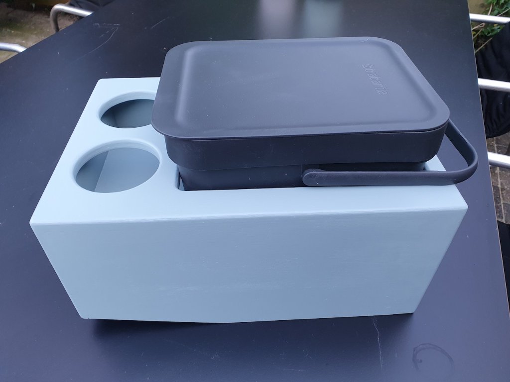 Ik heb het gemaakt voor een Brabantia Sort & Go van 6 liter. (De hogere versie van 12 liter past er ook in, maar dan kunnen de stoelen er niet overheen draaien en het klepje kan dan niet helemaal open vanwege de armleuningen)