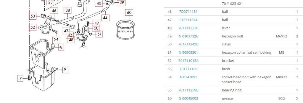 Het beste is om meteen allebei de bolletjes te vervangen en het busje dat nu gebroken is, dan kan je er weer jaren mee vooruit. Dus nummers 46, 47 en 53 op de tekening.