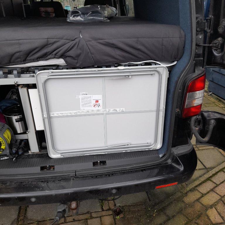 Omdat de ene VW camper de andere niet is hebben wij alles achterin plat liggen>