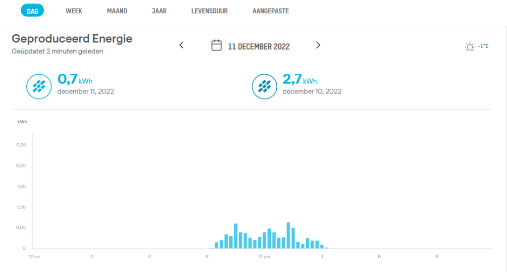 hier zijn ze al amper aan de praat te houden...... voorbeeld van opbrengst van 22 panelen á 380wp. Bijna ideale curve en minimale curve. Als je 3x100wp gaat plaatsen, heb je 'optimaal' minder dan 0,67 kWh terwijl de dag daarboven nog korter is en het traject van de zon nog vlakker.