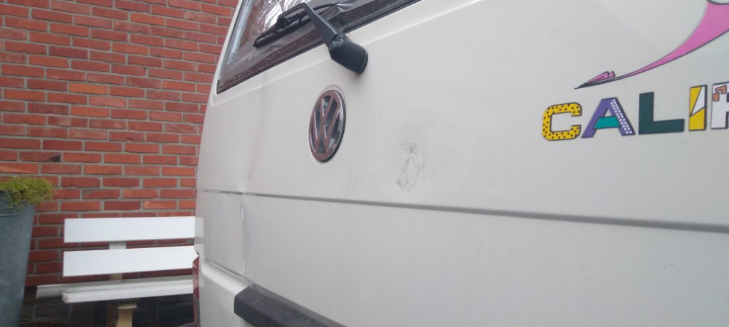 Spotrepair kan je wel vergeten, helemaal zo op een witte achterklep. Sticker zou ik door een sticker boer na laten maken, printen ze zo uit. Vervangende achterklep, mocht je die niet kunnen vinden met hoog logo, zou je eventueel het verdiepte deel waar het logo in valt over kunnen zetten/lassen. Zitten er nog meer verschillen in de achterkleppen? Succes met het herstel!