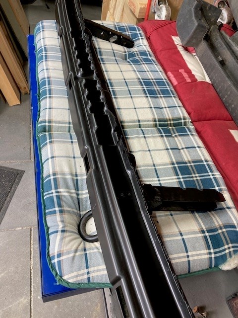 Nou vandaag gewerkt aan het monteren van een binnenbalk achterbumper. Ik heb gelukkig een nieuwe binnenbumperbalk kunnen bemachtigen. Na verwijderen van de kunststof buitenhoes kwam de trekhaak mooi in beeld. Eerst de binnenbumper proberen te plaatsen. Uhmm dat past niet lekker. Aan onderzijde tpv trekhaakkogel blijft te binnenbumper te hoog gepositioneerd. Dus een klein stukje eraf halen van de binnenbumper. Dat scheelt, nu kunt de hoogte mooi uit, alleen.... de bnnenbalk blijft te ver afzitten van de auto. Na wat meten, schuiven de maximale positie kunnen bepalen (de binnenbumper aansluitstrip ligt tegen de bevestigingspunten van de trekhaak. En dan nog ongeveer 2-3 cm te ver van de auto. Ik vrees dat de achterbumper niet met binnenbumper te maken is met dit type trekhaak.......