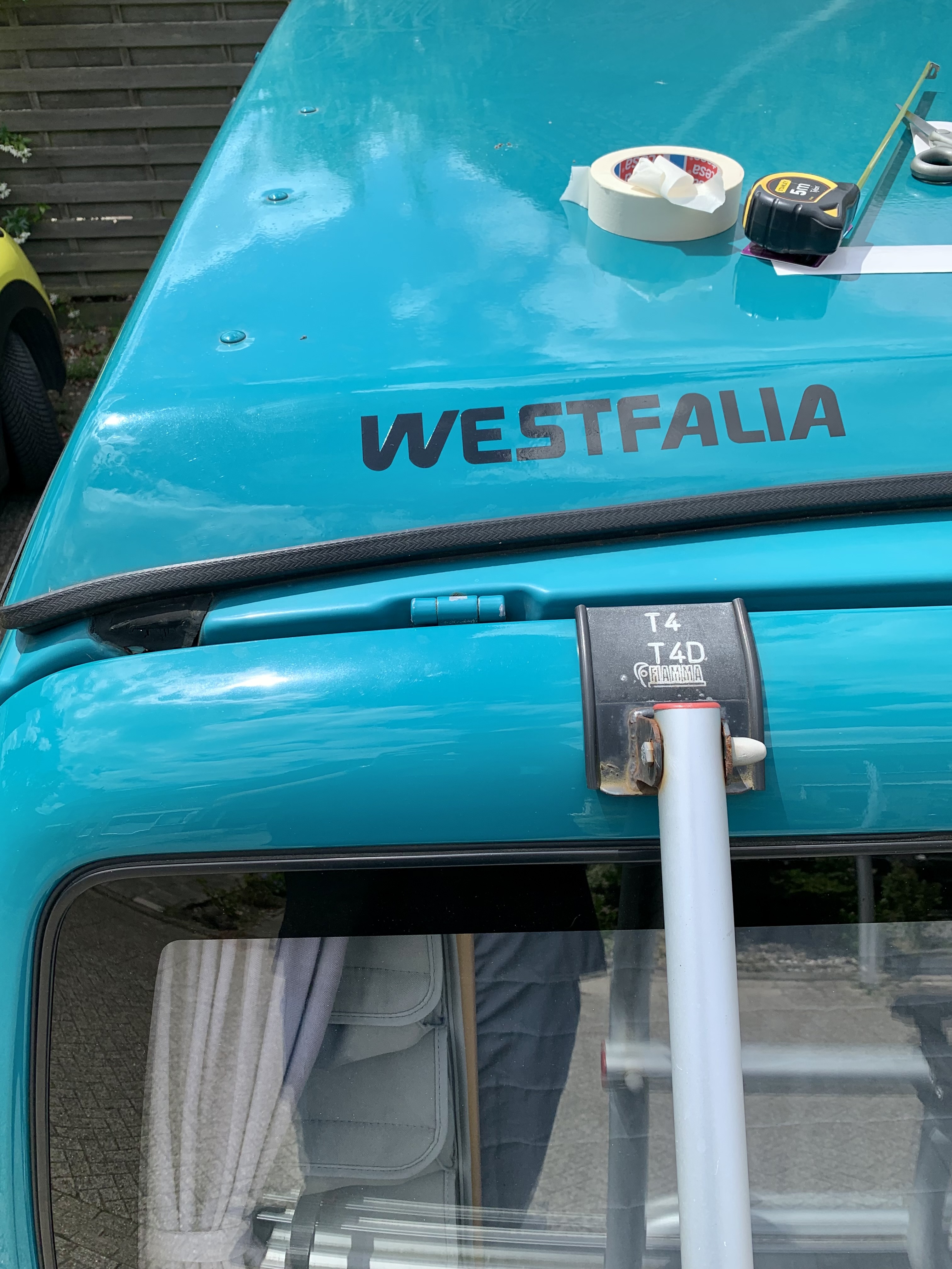 Bij mij zitten de originele Westfalia stickers op het dak allebei aan de bestuurderskant. Dus zowel voor als achter.