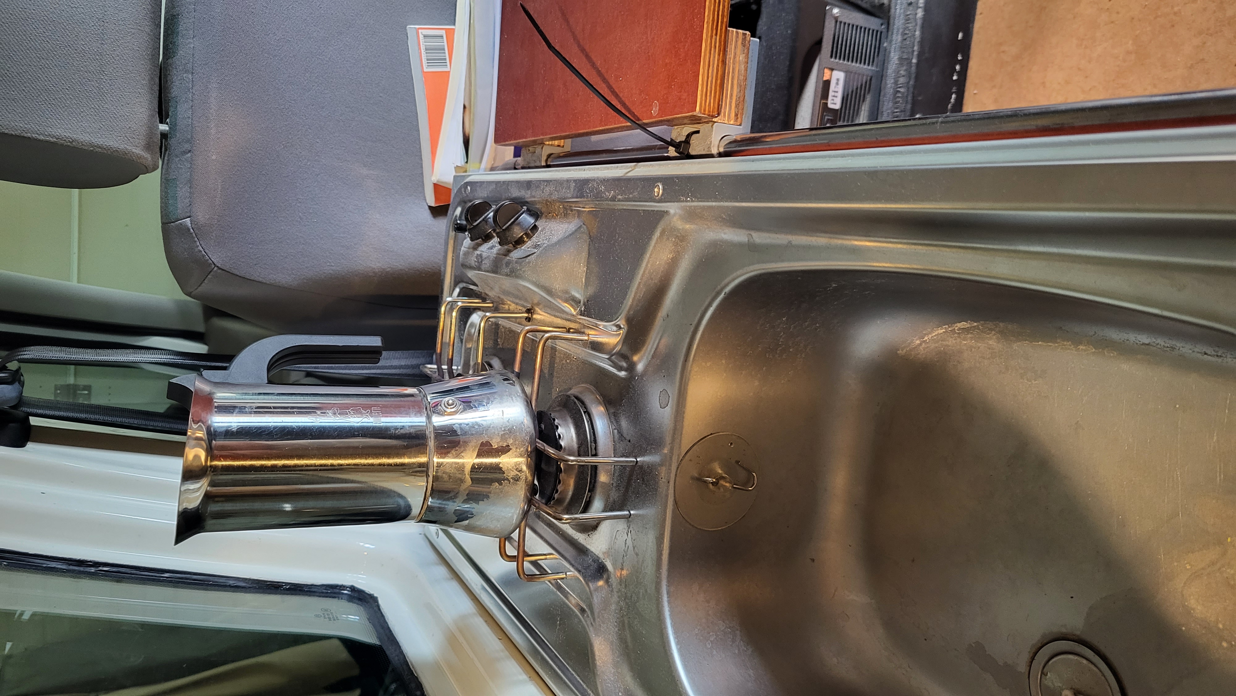 Daar doen we alleen heet water in. Het hete water maken we meestal met fluitketel op gas. Daarnaast een 12V waterkoker. 8A 40min voor 0,8L.