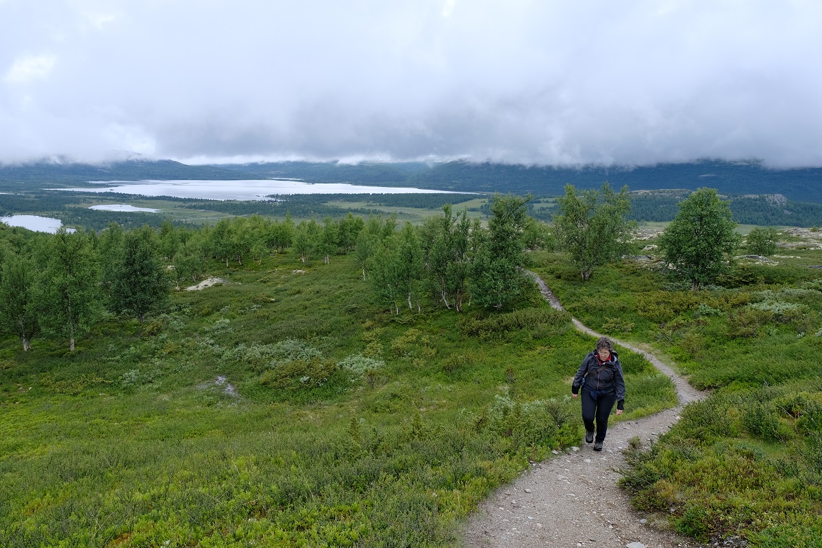 Bij de terugwandeling hingen de wolken een pak lager. En per kilometer regende het harder. Gelukkig hadden we niet alleen een regenjas aan maar ook een regenbroek....die duidelijk enkel nuttig is om thuis naar het station te fietsen, zo'n 3km verder. Tegen deze Noorse regen echter blijken onze broeken niet bestand!
