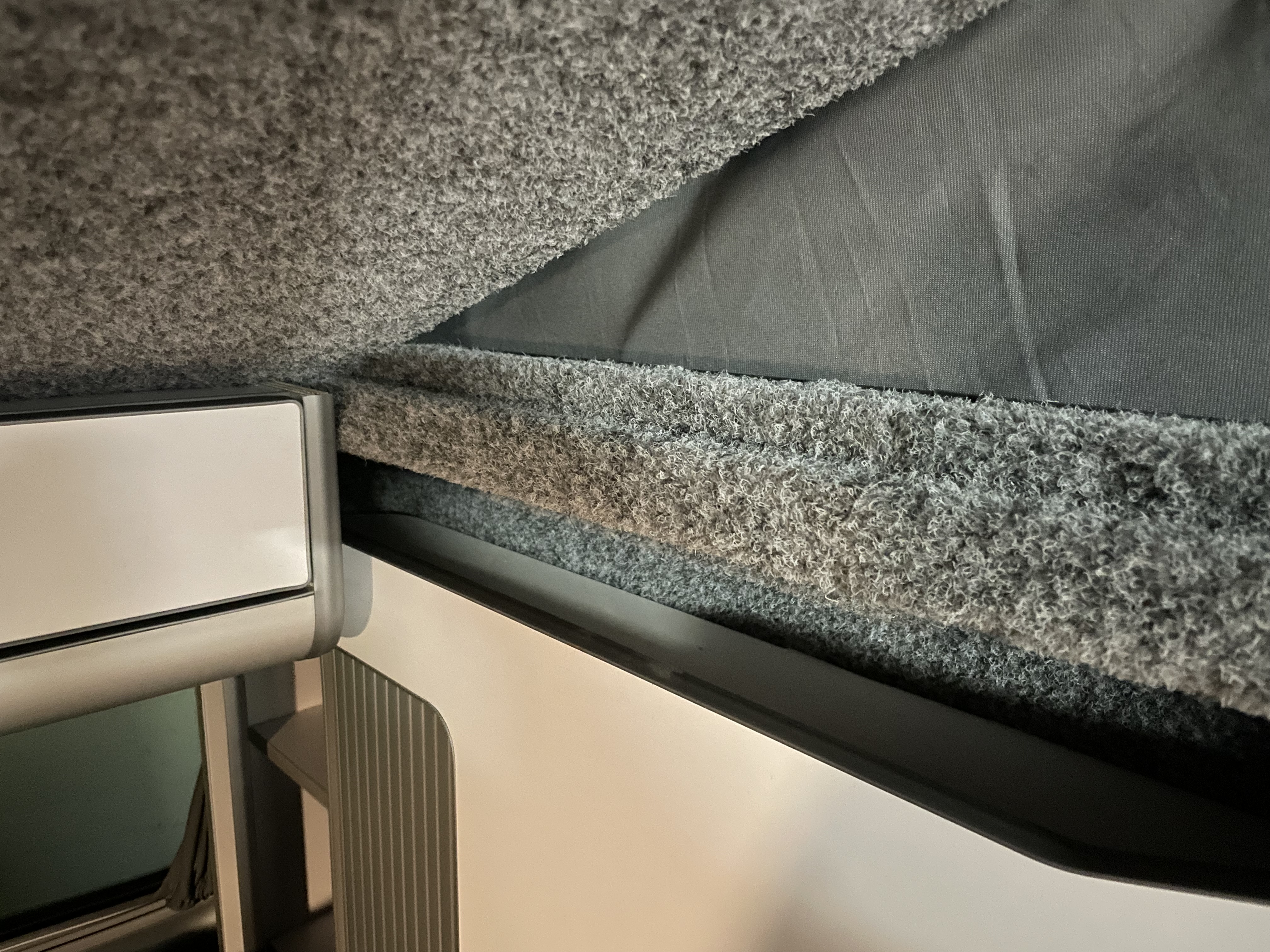 Kun je die vlap van de hemel die uitsteekt niet omhoog vouwen tegen de rand aan, dan vast lijmen en af en toe een popnagel met een strook stretchvilt de verbinding overlappen, of is dat board