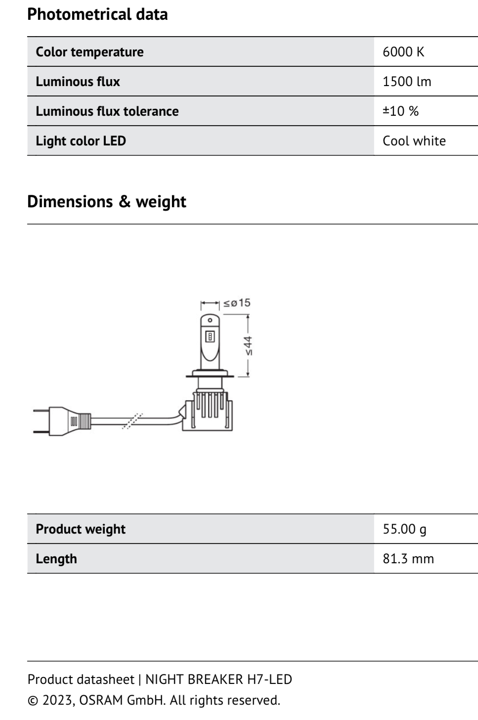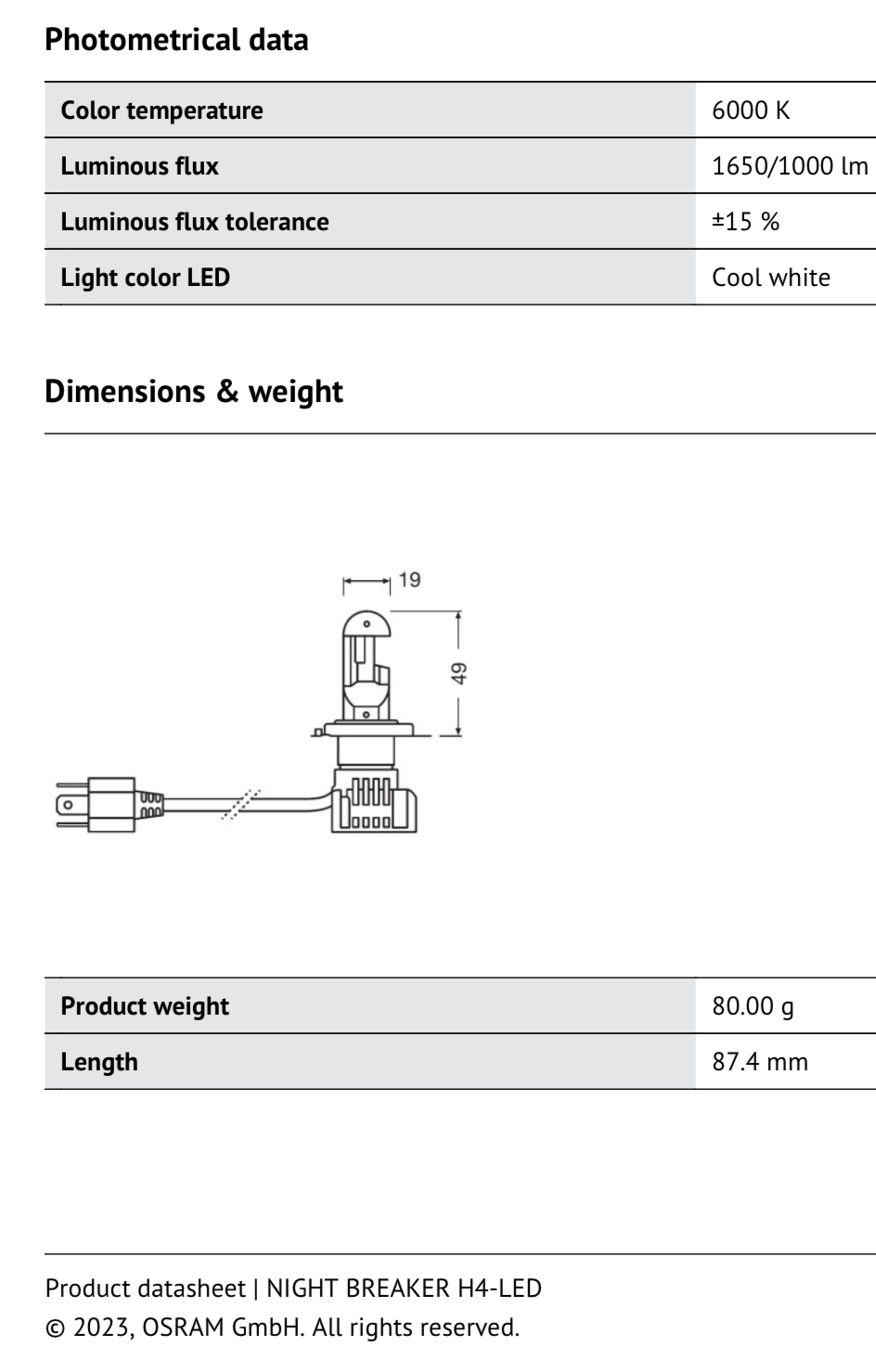 Dit staat er in de datasheet van de H7 Nightbreaker Led. Vervolgens de datasheet van de H4