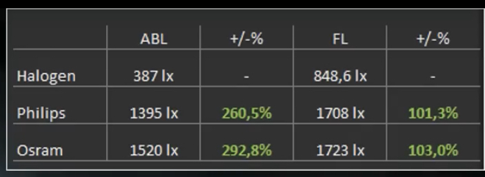 In het vergelijkingsfilmpje tussen de Philips en de OSRAM H4 wordt het aantal Lux met een luxmeter gemeten.