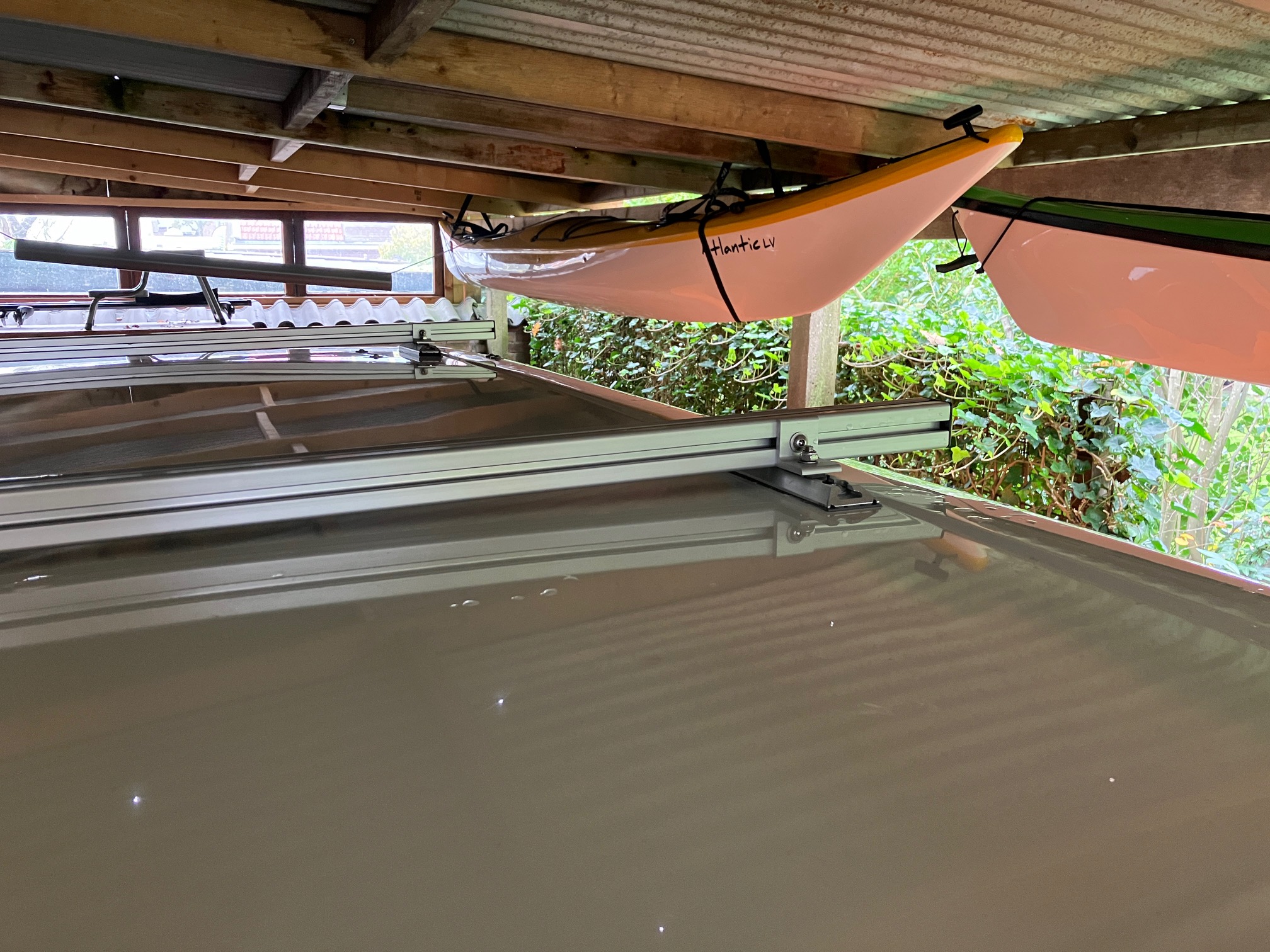 Ik ben uitgekomen op "airlinerails" met daarop aluminium profielen. Aan de binnenzijde contraplaten gemaakt. De kajaks liggen op voorgevormd foamblokken en niet in beugels.