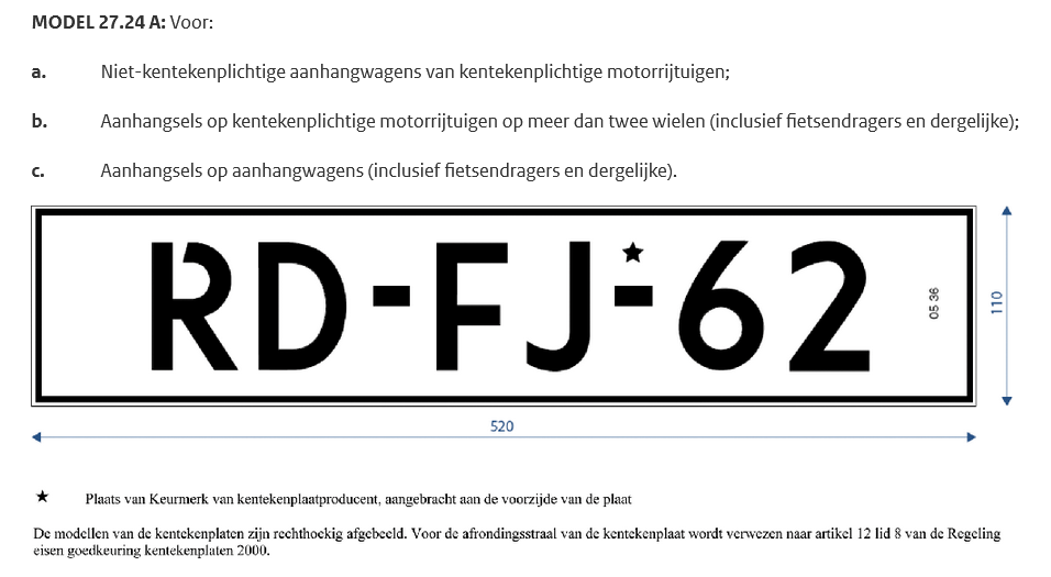 De plaat zelf niet, daar mag ook helemaal niets op. Maar met witte plaat op aanhanger, last- of fietsendrager moet je wel een vanouds bekende ovale NL sticker ERBIJ voeren. (of als je nog antiek met blauwe oldtimerplaten hebt ook)